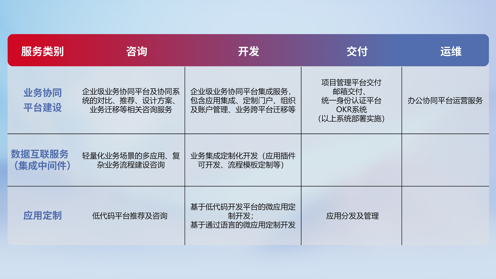 针对钉钉、、、企微、、IDaas等平台级产品提供产品的规划、、方案、、、、交付、、定制化开发等服务,,实现如统一协同办公、、智能客户服务、、混合会议管理、、、、智能数据查询、、、、等业务场景,,,,实现数字化转型。。