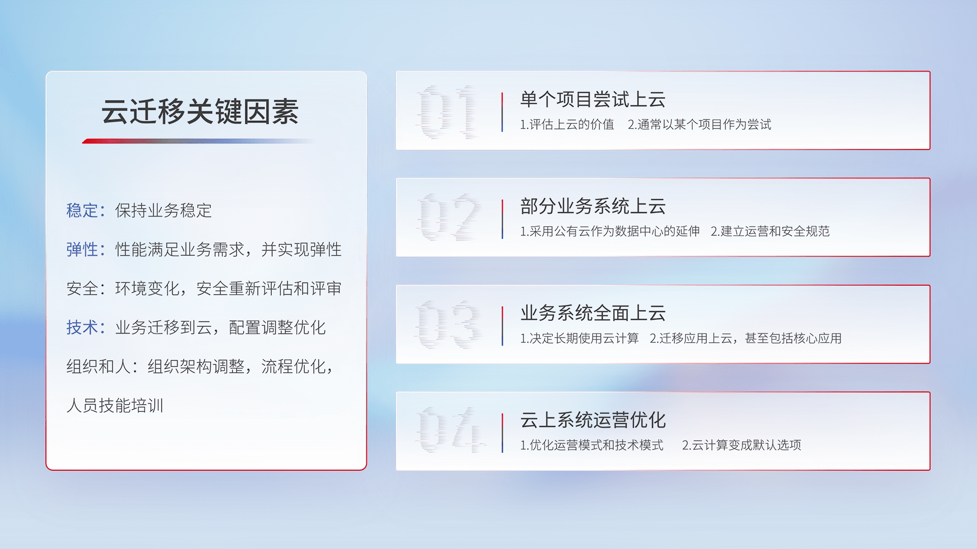 结合实际业务,,,,从规划设计、、、云平台选型、、云原生改造、、数据迁移、、、集成交付,,,,迁移全过程为客户识别最佳上云路径,,,,做好风险识别管理,,设计网络架构、、、身份权限、、、、安全审计合规、、、、操作审计、、、日志审计、、监控告警策略、、、多站点容灾设计等,,,,对云上基础设施进行整体规划,,,,提升IT治理水平,,,以满足弹性、、高可用、、、、高性能的需求。。
