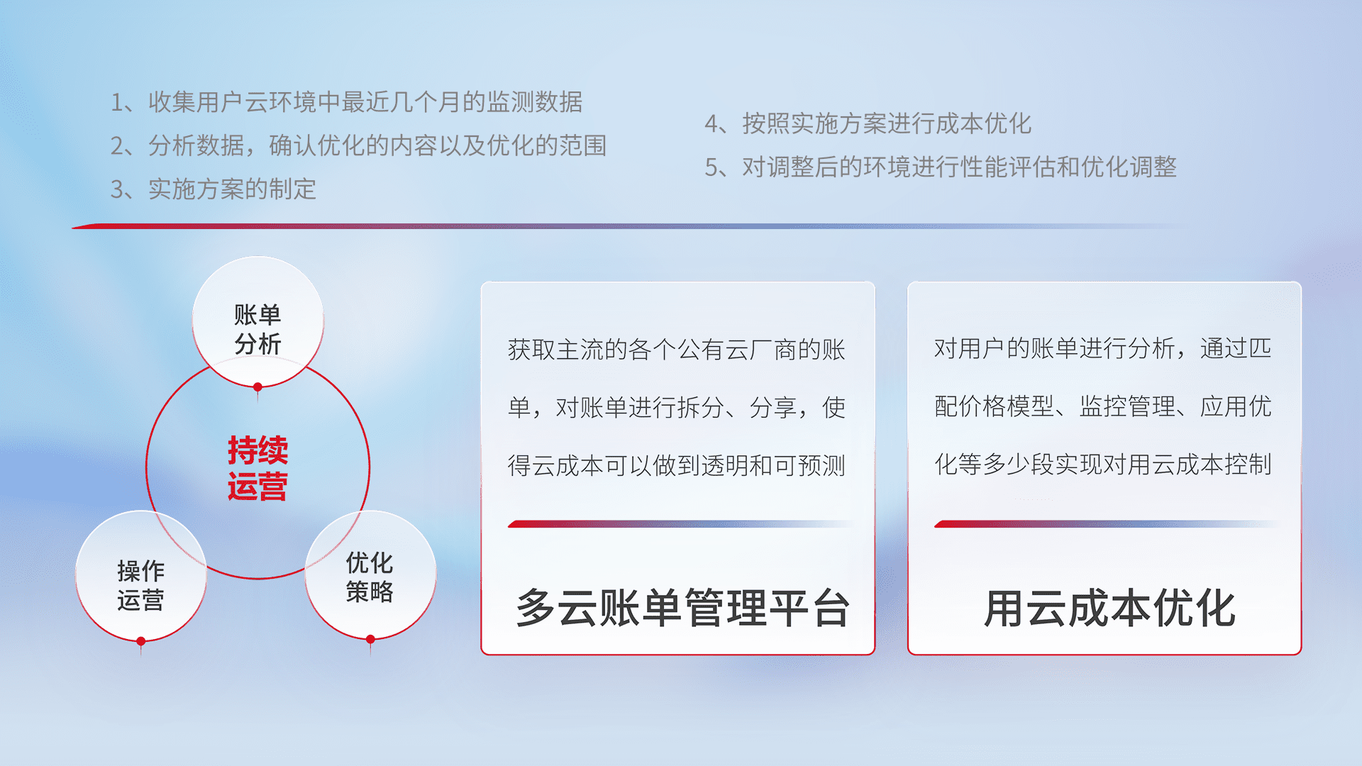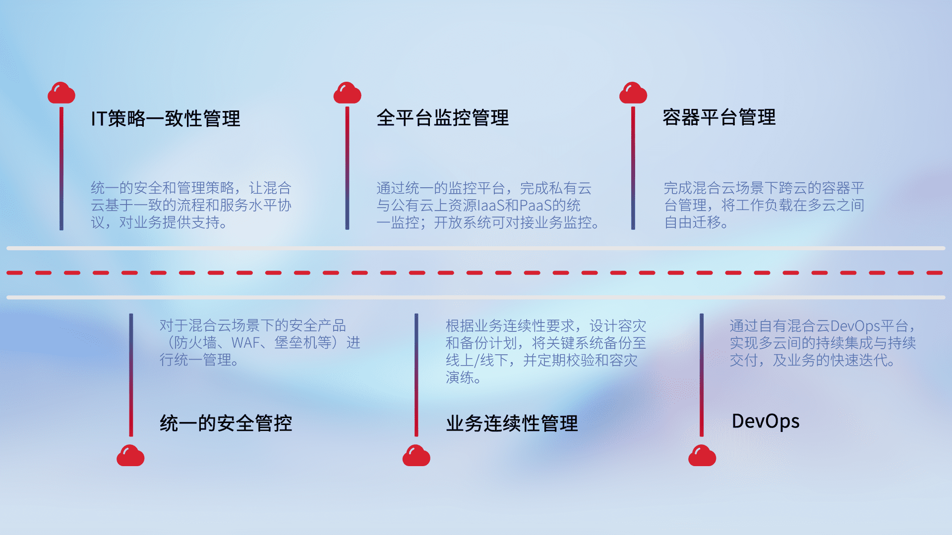 通过多云纳管,,,以统一的资源数据模型把客户的云资源进行抽象和封装,,进而实现对多云资源的统一操作,,保障云资源管理的可靠性、、稳定性与可用性。。。量身定制化运维内容,,,,配置、、、、开发运维、、、、补丁管理、、、备份、、、、监控、、、、认证和访问管理、、、、审计和日常巡检等,,,保障在用云过程中的可靠度,,,,稳定度以及高可用率。。。。