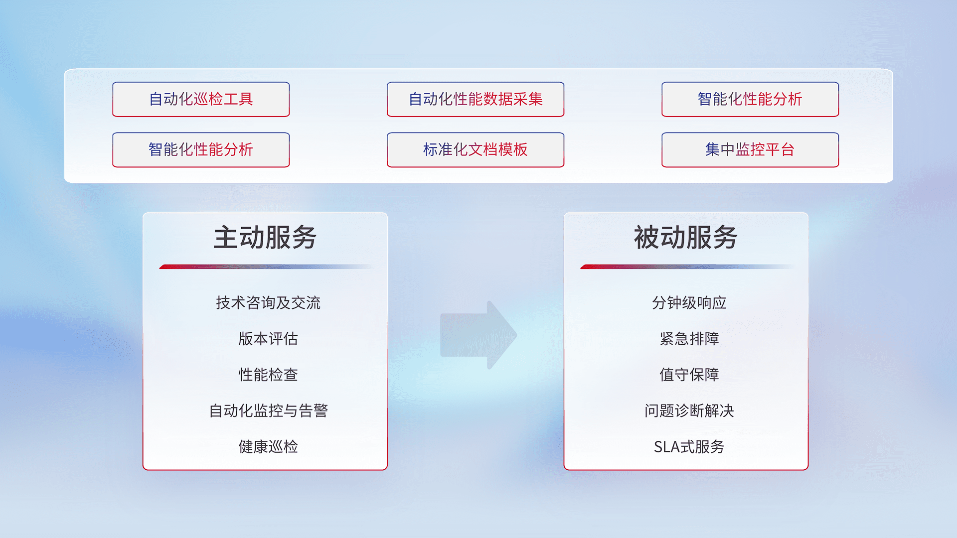 智能化工具和标准化文档,,,,保障服务质量,,,提供主动服务(包含技术咨询、、、、版本评估、、性能检查、、、、自动化监控与告警、、、健康巡检)和被动服务包含(分钟级响应、、、、紧急排障、、、、值守保障、、、、问题诊断解决、、、SLA服务)。。。。